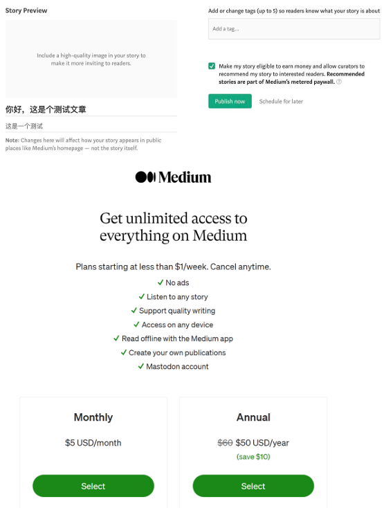 加入付费墙的文章,在预览界面会有一个五角星的图标。如果读者想阅读付费墙内的文章,那么就必须开通Medium会员,费用为每月固定的5美金。假设这名读者在1个月里在Medium上阅读了10篇付费文章,那么10篇文章的作者将会分享5美金的收益。其分配算法是按照读者的阅读时间比例来分配,读者在某篇文章停留的时间越长,则该篇文章的创作者分得的收益比例越高。