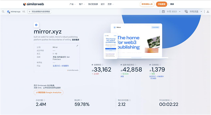 根据similarweb 的数据,Mirror 官网 2023 年 10 月的总访问量为240万次。平均访问时长为2分22秒。