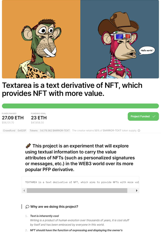 创作者可以使用Crowdfund功能为项目筹集资金。例如,某个DAO创作者可以基于一本正在构思但尚未完成创作的书发起众筹,并基于这本书发行代币,参与众筹的用户成为这本书的股东。当书稿制作完成时,可以铸造成NFT进行售卖,参与众筹的读者可以按照事先约定好的机制参与收益分成。