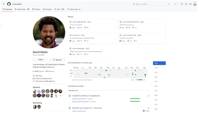 下图是 GitHub Sponsors 功能首页展示的一位被赞助者:David Nolen,ClojureScript 的首席开发者。David Nolen 在 GitHub 上拥有约 4,200 名关注者,目前拥有34名赞助人,曾拥有50名其他的赞助人。同时,David Nolen也是两名GitHub 用户的赞助人。