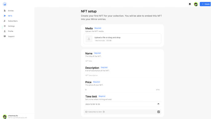 在 Mirror 上发布的文章,创作者可以选择将其铸造为 NFT,并创建 NFT Collections。创作者可以设置 Collections 的名称、价格、版税比例、发行网络、发行数量、挖矿时间等信息。读者可以在规定的时间内,mint该系列的NFT成为其collectors。