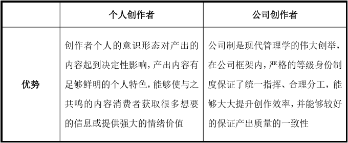 在目前的互联网平台上,可以把创作者大致的分为两类,即“个人创作者”与“机构创作者”。其中机构创作者绝大多数是传统的公司创作者,虽然红十字会等非营利组织作为机构创作者也会产出内容,但这部分内容涉及的领域较窄,且占比很低,因此不在此文做过多讨论。对于个人创作者和公司创作者而言,两种模式各有其优劣势: